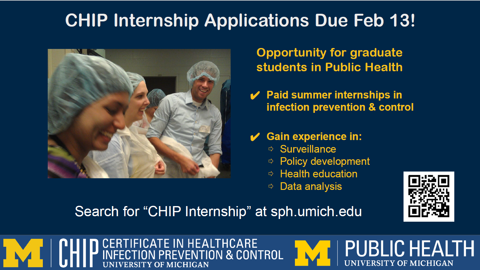 Feb13CHIP Summer Internship application deadline The Certificate in Healthcare Infection Prevention & Control (CHIP) provides UM SPH students and other UM students in a graduate-level program with IP training.