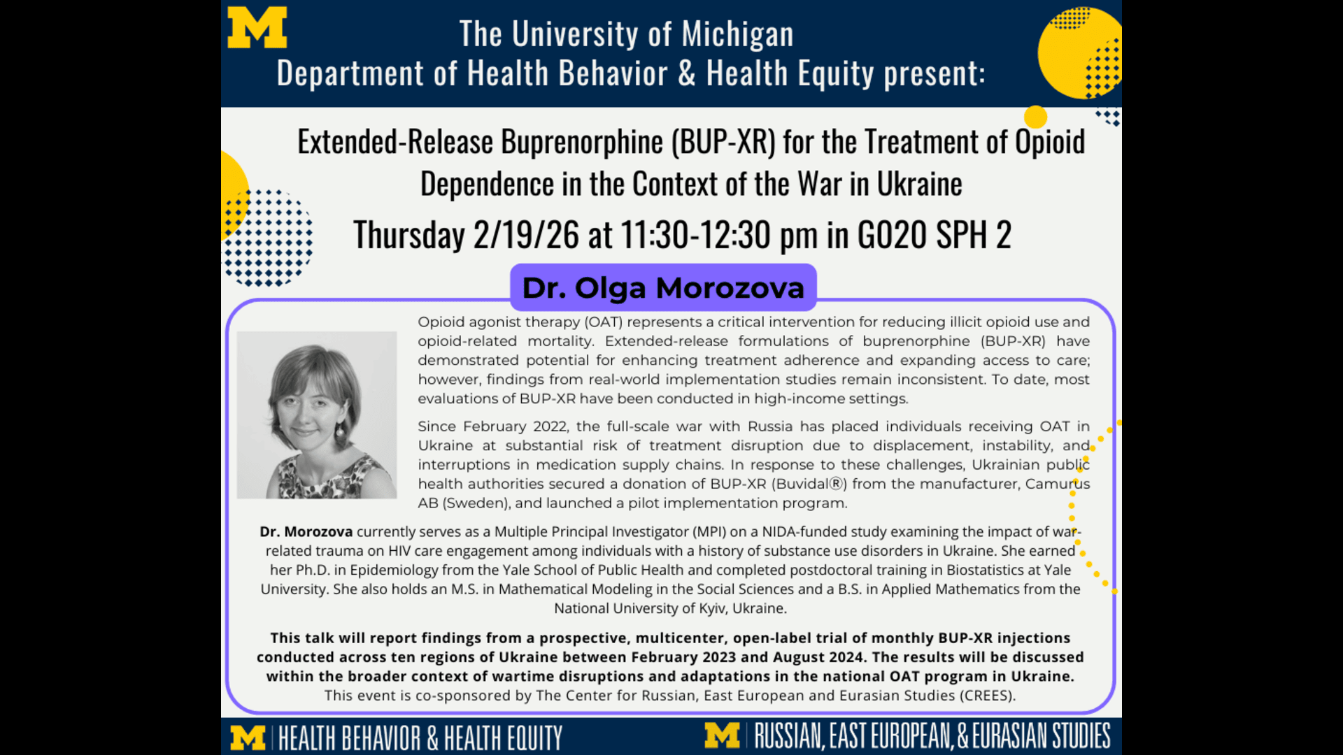 Feb19Extended-Release Buprenorphine (BUP-XR) for the Treatment of Opioid Dependence in the Context of the War in Ukraine This talk will report findings from a prospective, multicenter, open-label trial of monthly BUP-XR injections conducted across ten regions of Ukraine between February 2023 and August 2024.