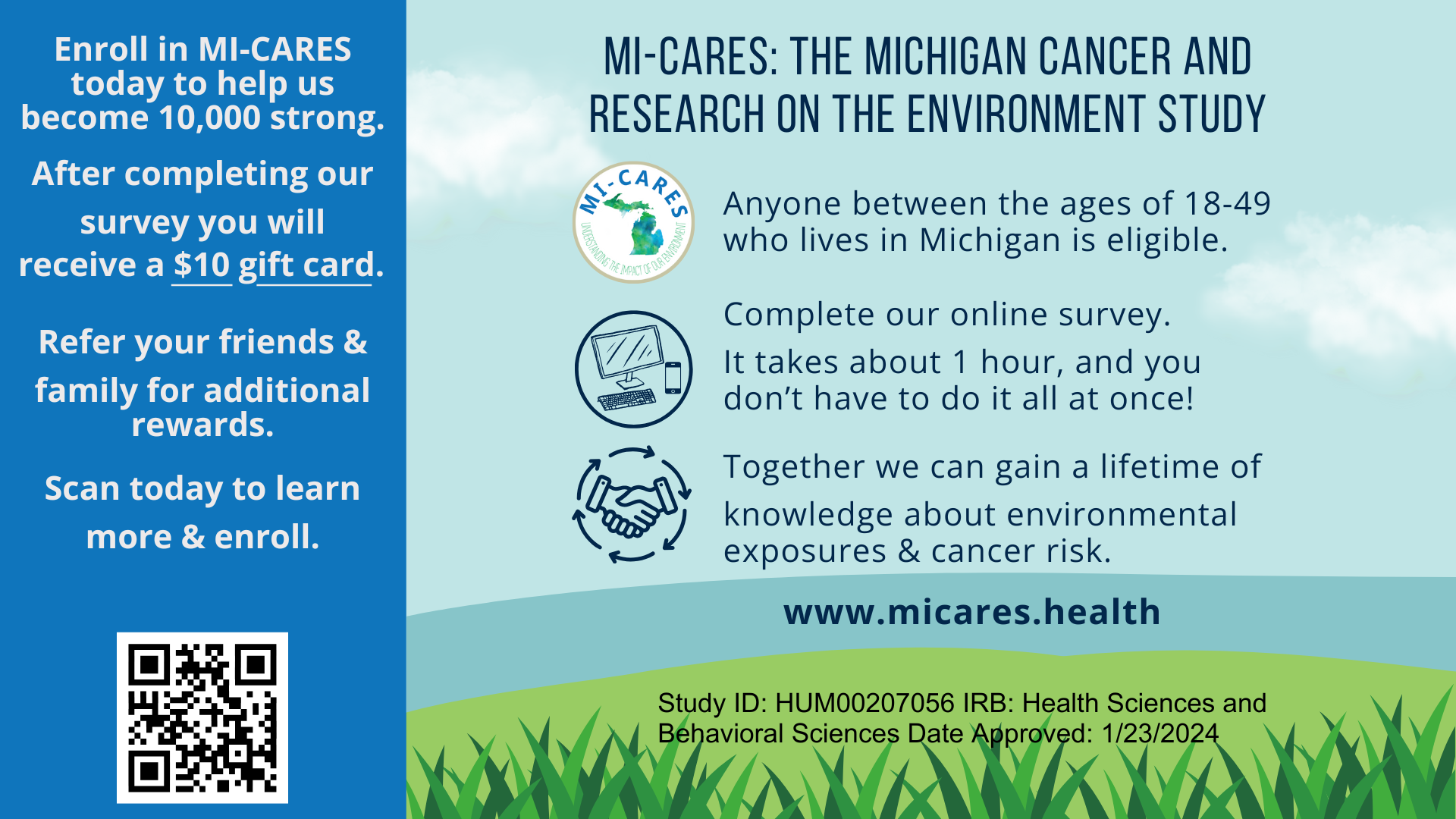 MI-CARES Spring Recruitment Help us understand how the environment in Michigan impacts our health by joining MI-CARES